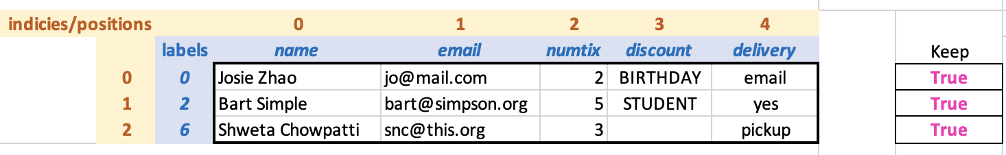 There are two notions for how to access specific cells in tables and DataFrames: by numeric position (e.g., first row, second column) or by labeled index (e.g., numtix). Both have their roles in professional-grade data analysis programming. Filter-like operations that extract rows from tables maintain labeled indices, but renumber the positional ones (so that every DataFrame has a sequence of consecutively-numbered rows).